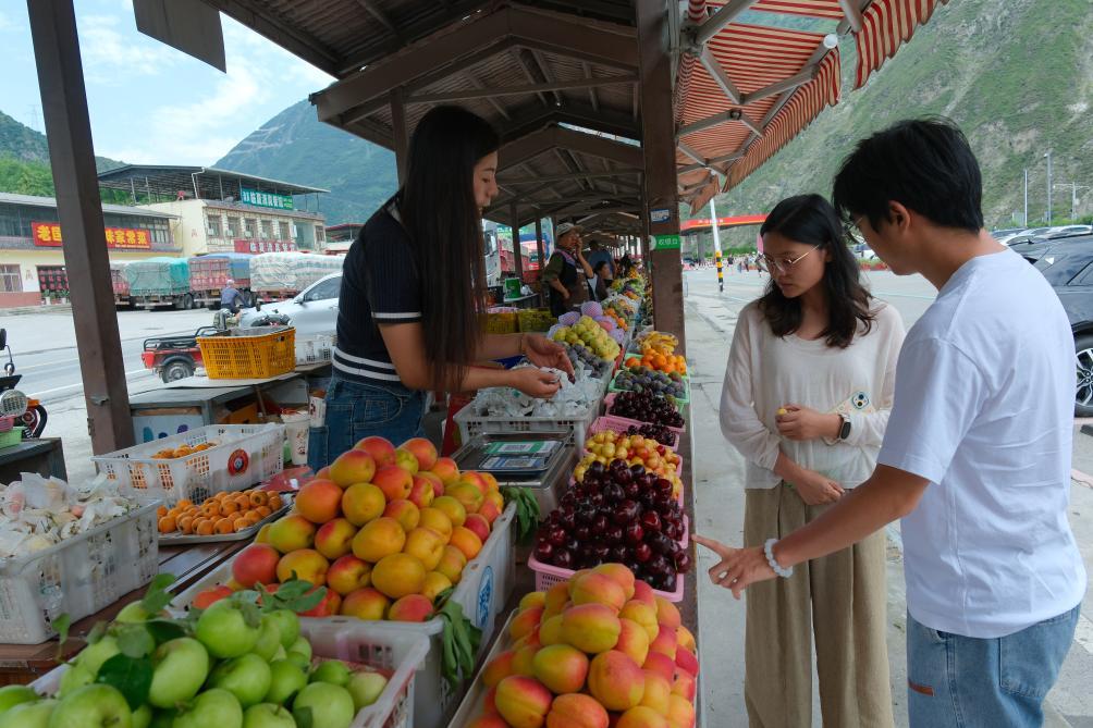 游客在都汶高速公路绵虒服务区购买当地特色农产品。新华社记者萧永航 摄