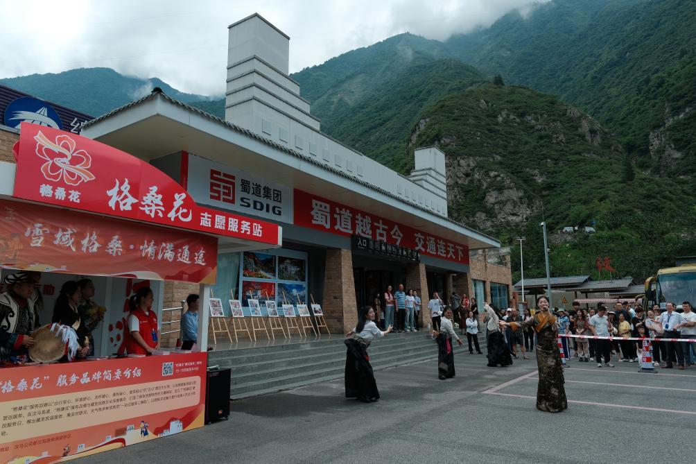 蜀道集团藏高汶马公司“格桑花”服务团队在服务区表演民族歌舞。 新华社记者萧永航 摄