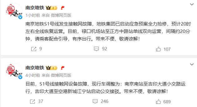 7月1日晚,@南京地铁发布最新消息:南京地铁S1号线发生接触网故障,地铁集团已启动应急预案全力抢修,预计20时左右全线恢复运营。