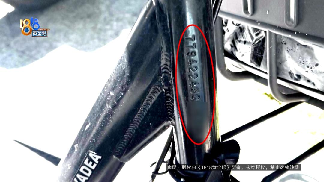 记者和小李把车子翻来覆去看了几遍,没有看到车架号,附近停放了好几辆,带有“雅迪”标志的电动自行车,有几辆的车身上能看到“7794”开头的一串数字。