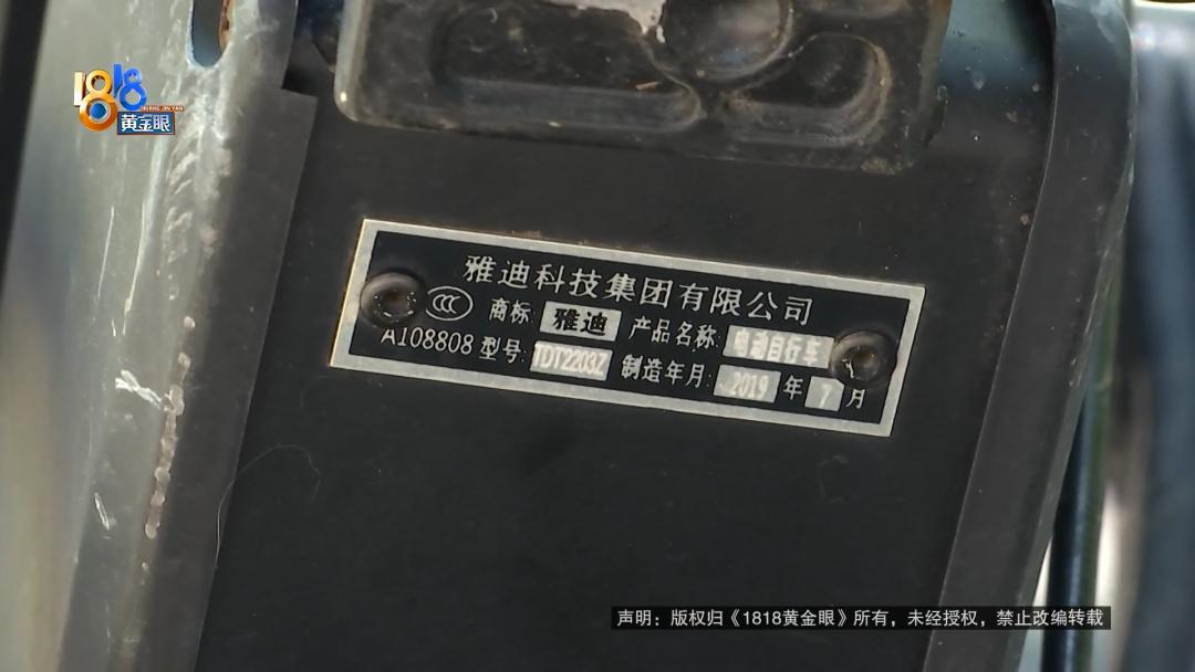在车轮旁的车架上有一块铭牌,上面写着雅迪科技集团有限公司,标注了型号和制造年月等,小李说起了这辆车的来历。