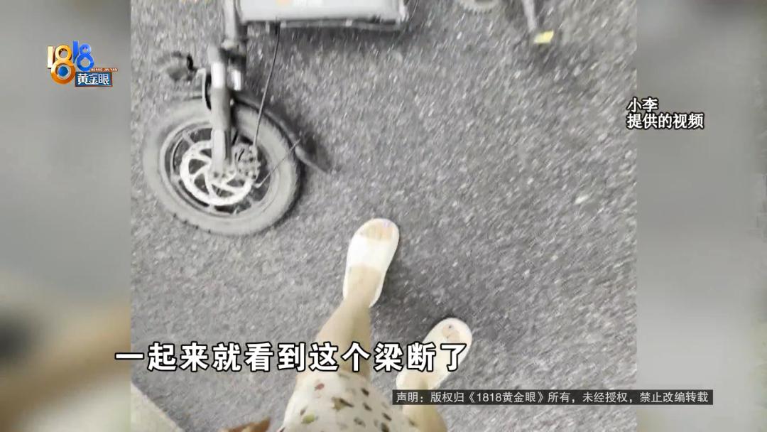 小李:6月23号那天,早上9点45左右,我从我家这边出发,在小区到大概34幢的地方,骑着骑着感觉被谁推了一把一样,“吧唧”就摔地上了。在地上待了很长的时间,我很懵,一起来就看到这个梁断了。是这个梁断了才导致我摔的。中间那个地方,就“一刀两断”了。