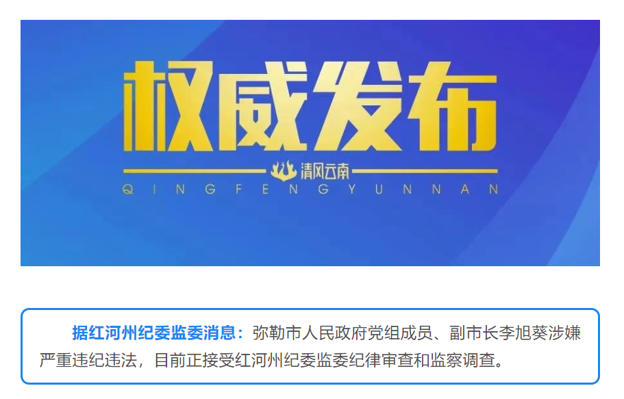 弥勒市人民政府党组成员、副市长李旭葵涉嫌严重违纪违法,目前正接受红河州纪委监委纪律审查和监察调查。