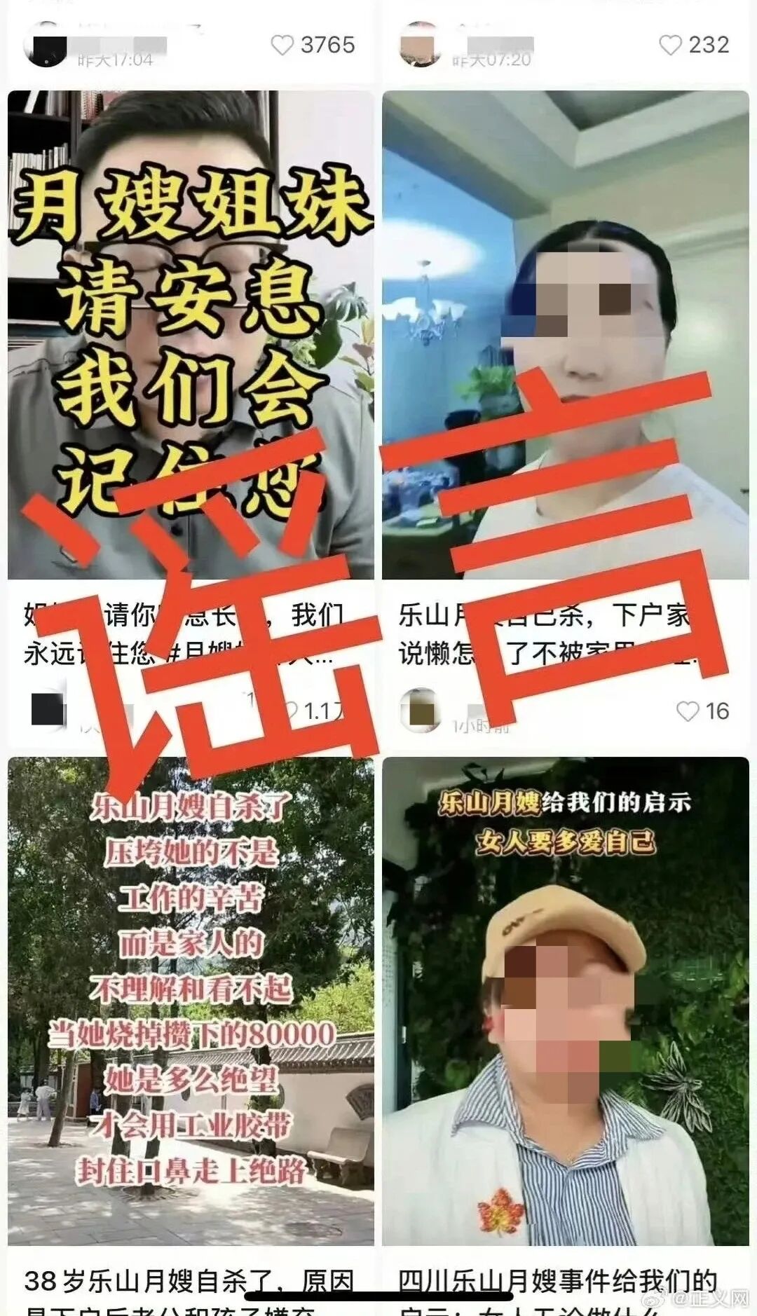 “四川乐山月嫂不堪工作压力自杀”系谣言。来源:乐山警方