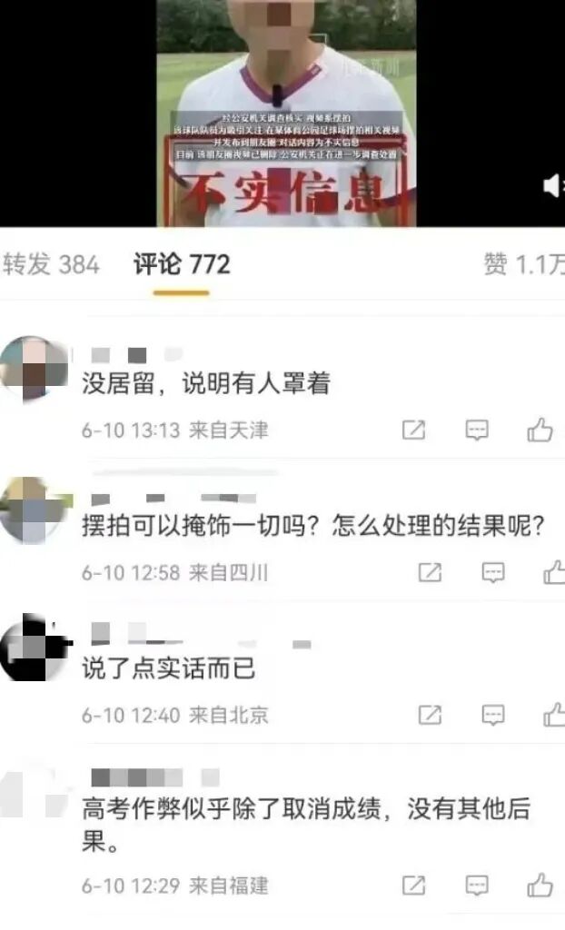 “高考作弊家长用钱摆平”辟谣新闻评论区留言。来源:九派新闻