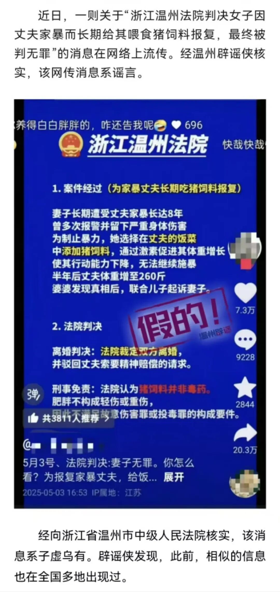 “女子为报复家暴丈夫喂猪饲料被判无罪”系谣言。来源:温州辟谣
