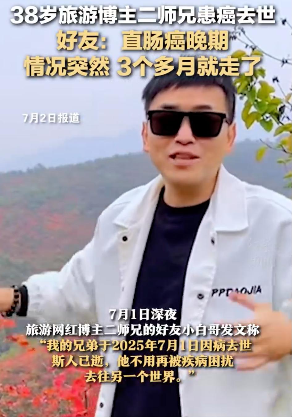 7月1日深夜,旅游网红博主二师兄的好友小白哥发文称,“我的兄弟于2025年7月1日因病去世,斯人已逝,他不用再被疾病困扰,去往另一个世界。”