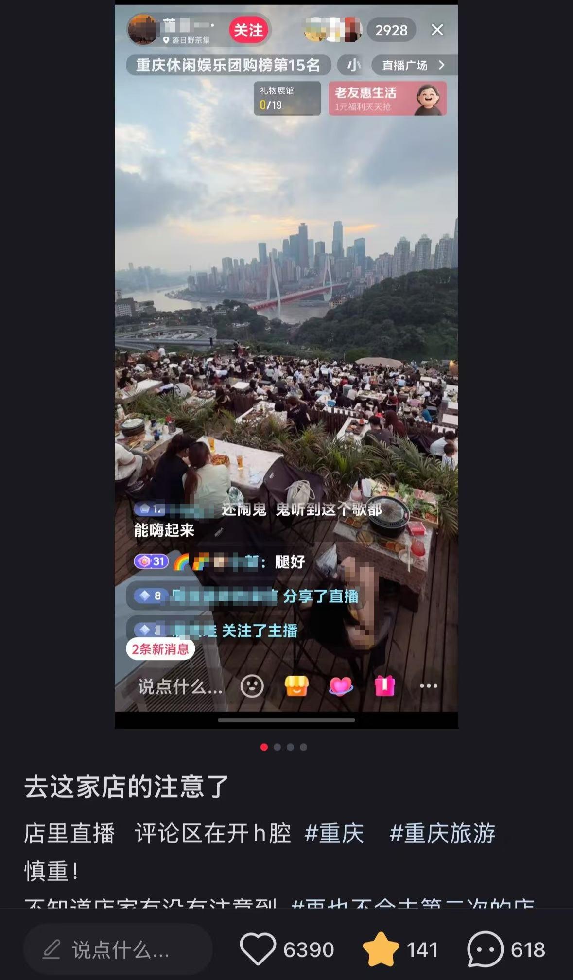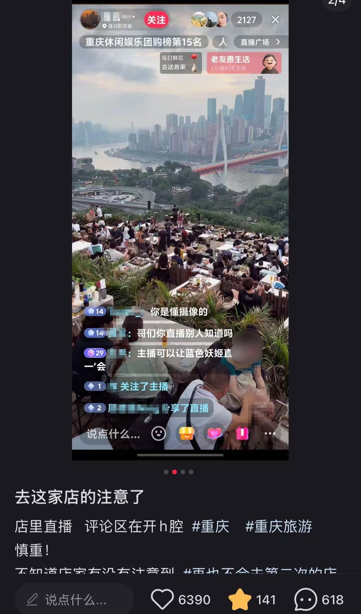 网友发帖称,去这家店的注意了,店里直播评论区在开h腔,重庆旅游慎重!不知道店家有没有注意到。相关直播截图中,有网友在直播中评论“腿好”、“你是懂摄像的”、“哥们,你直播别人知道吗”。