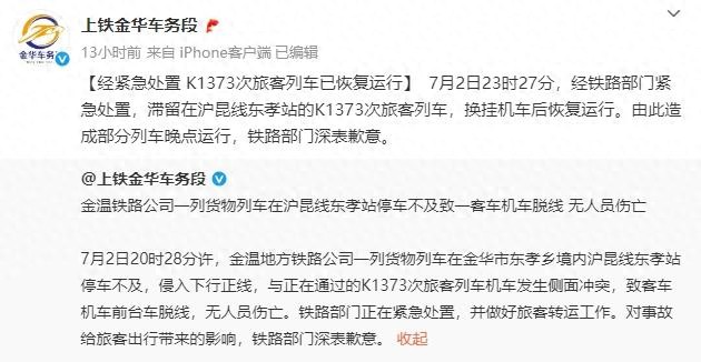 K1373次列车突发意外停运引发关注。上海铁路局金华车务段7月2日晚发布通报称,7月2日20时28分许,金温地方铁路公司一列货物列车在金华市东孝乡境内沪昆线东孝站停车不及,侵入下行正线,与正在通过的K1373次旅客列车机车发生侧面冲突,致客车机车前台车脱线,无人员伤亡。