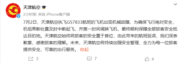 @天津航空 发文称,7月2日,天津航空执飞GS7833航班的飞机出现机械故障,为确保飞行绝对安全,机组果断处置及时中断起飞,并第一时间调换飞机,最终顺利保障全部旅客安全抵达目的地。天津航空始终将旅客的安全置于首位,由此带来的航班延误,我们深表歉意,感谢旅客的理解。未来,天津航空将持续加强安全管理,全力为每一位旅客提供安全、可靠的出行服务。