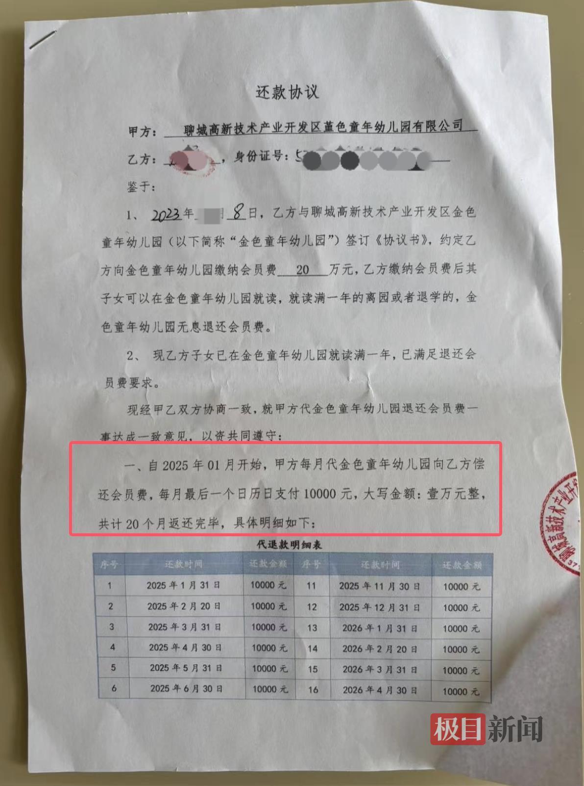 协议书显示,自2025年1月开始,甲方(聊城高新技术产业开发区堇色童年幼儿园有限公司)每月代金色童年幼儿园向家长偿还会员费,每月最后一个日历日支付10000元,共计20个月返还完毕。可就算是分期还款,这笔钱也是迟迟未到账,上述家长称,目前为止,他只拿到了1万元退款。