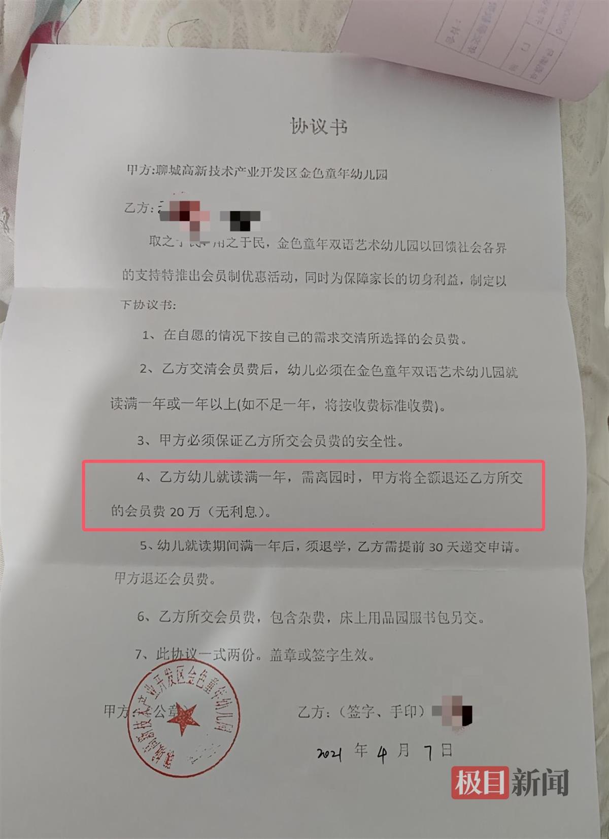 上述家长反映的民办幼儿园,是位于聊城市高新区的堇色童年幼儿园(原名金色童年幼儿园)。家长与园方签订的协议书显示,幼儿就读满一年,需离园时,园方将全额退还家长所交的会员费20万元(无利息)。家长交会员费后,幼儿必须在幼儿园就读满一年或一年以上(如不足一年,将按收费标准收费)。而家长所交会员费,包含杂费,床上用品园服书包费用另交。
