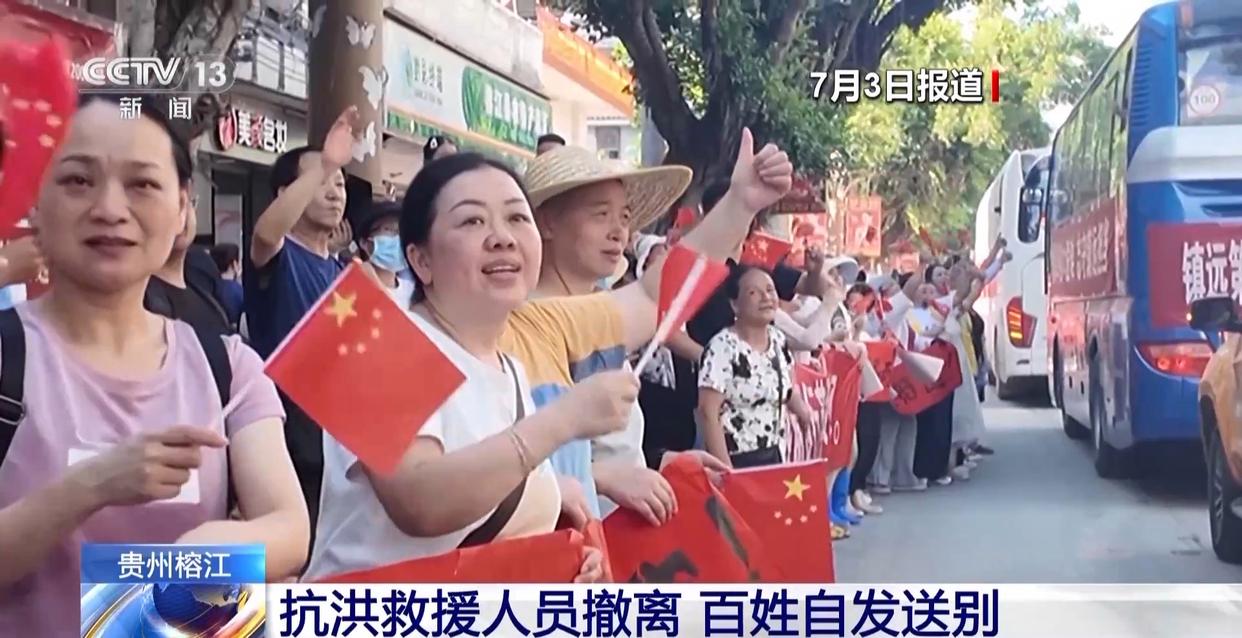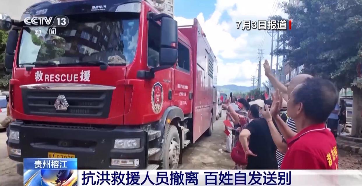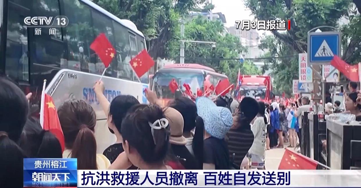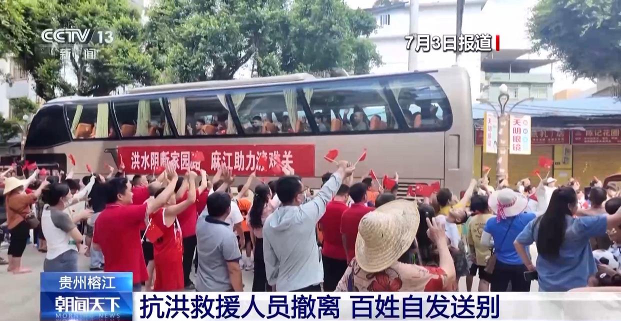 这几天,首批来支援的7000多人分别住在榕江三中、四中、六小等地。7月3日下午,他们在各自的住宿点附近乘坐大巴车,途经滨江一号大道、古州二小等地,从榕江一桥上高速驶离榕江。因为前来送别的当地百姓太多,老城区内三公里左右的路,行驶了一个多小时。