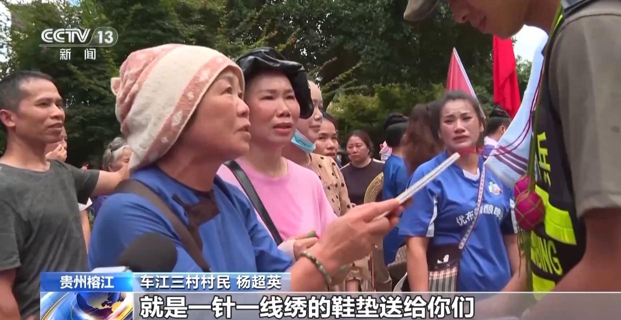总台记者 田尹男:我现在是在贵州省榕江县的榕江三中,来自车江二村、车江三村的民众要给为负责他们片区的来自黄平的民兵送行。道路两边站了很多当地的老百姓,他们自发带着红鸡蛋、五彩绳、鞋垫、毛巾等礼物给大家送行。