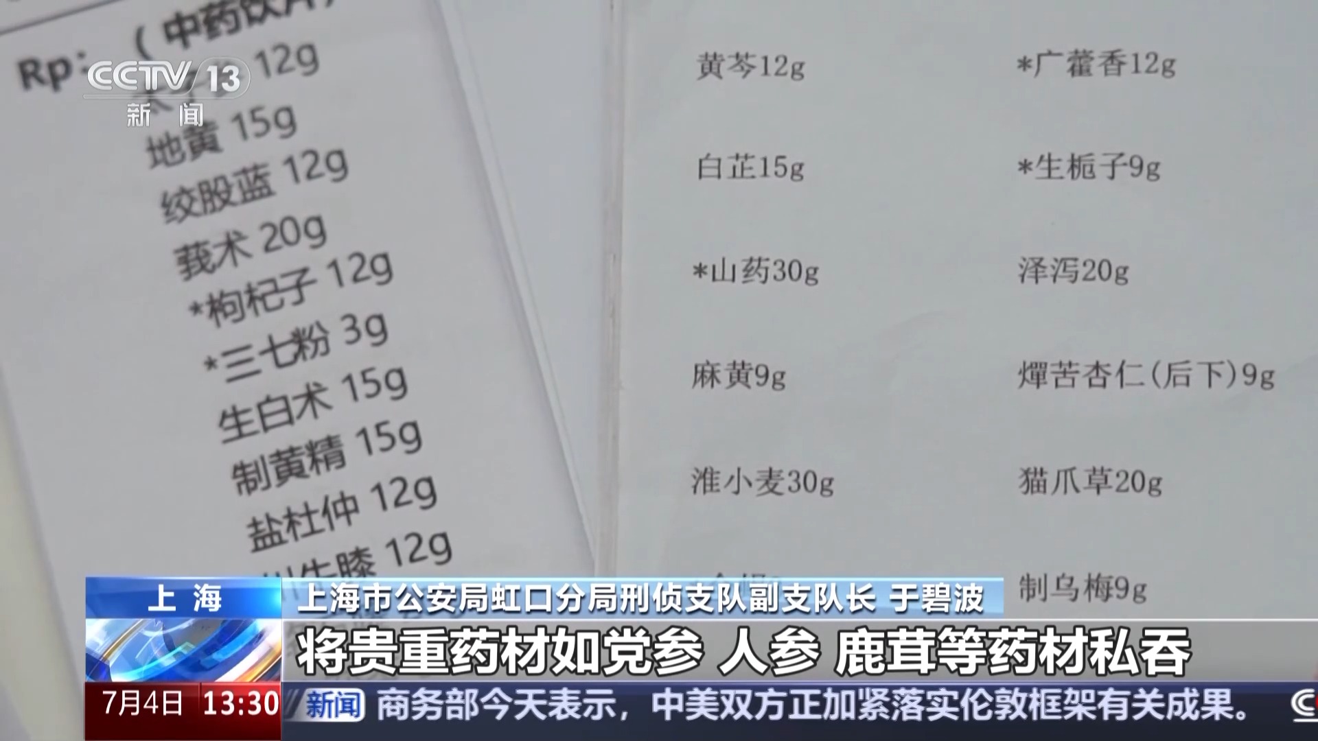 上海市公安局虹口分局刑侦支队副支队长 于碧波:将贵重药材如党参、人参、鹿茸等药材私吞,或为“黄牛”带来的参保人员开具价格高达600至1000元不等的名贵中药,通过自己名下的饮片制药厂给参保人员寄送极低成本的汤剂,以此留下快递记录,以防止有关部门的检查。