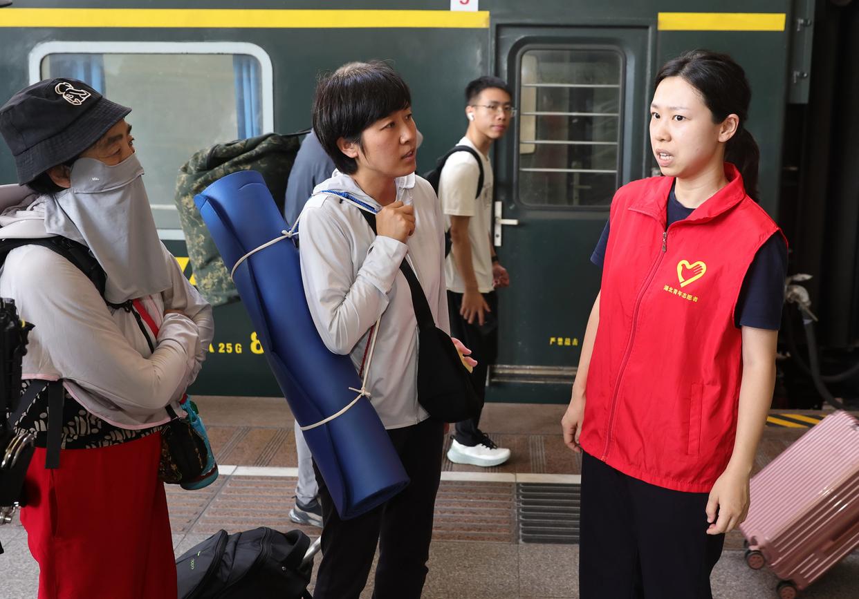 7月4日,在湖北省武汉市武昌站,志愿者为旅客提供乘车咨询服务。新华社发(赵军摄)