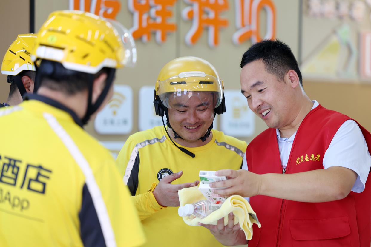 7月3日,在山东省临沂市郯城县郯城街道郯中社区“暖蜂驿站”,党员志愿者为外卖骑手送上藿香正气水、风油精、毛巾等防暑物品。新华社发(张春雷摄)