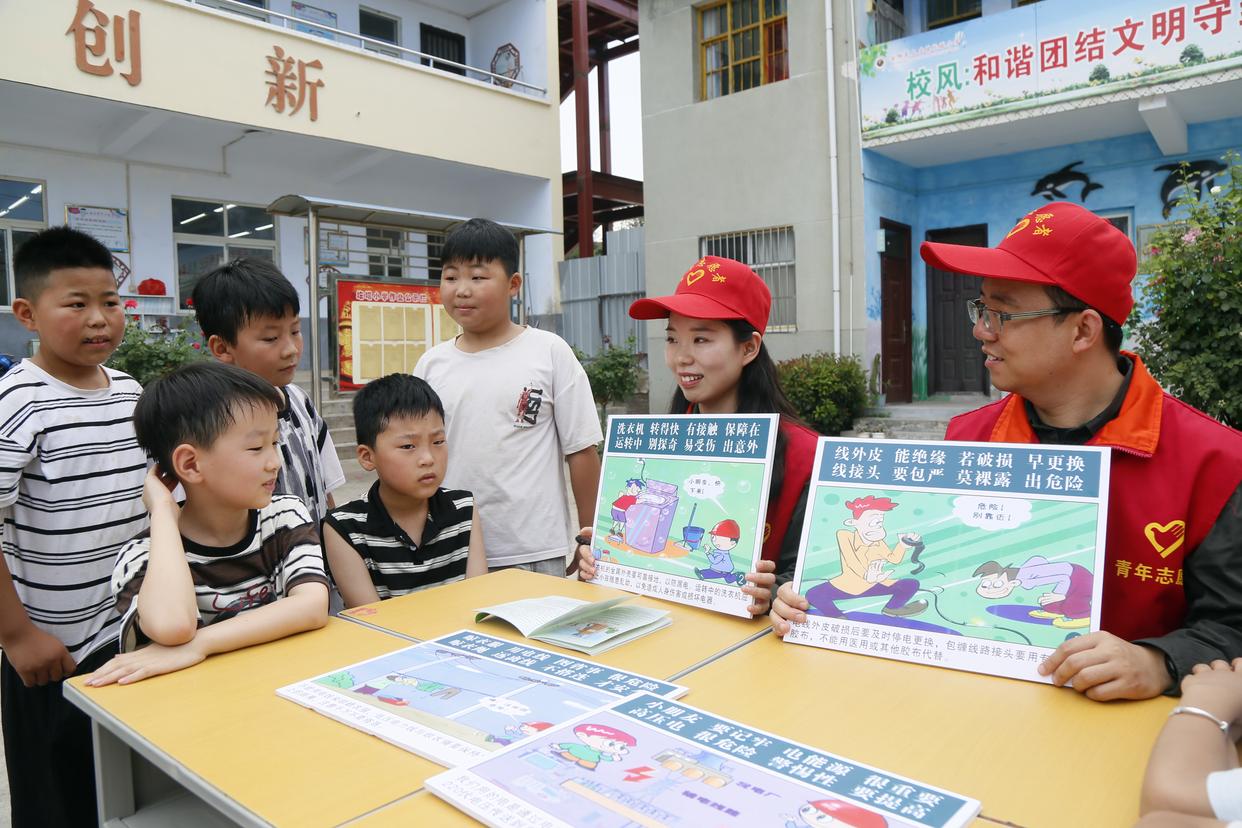 7月3日,河南省洛阳市汝阳县供电公司青年志愿者在上店镇圪塔村小学为留守儿童普及安全用电常识。新华社发(康红军摄)