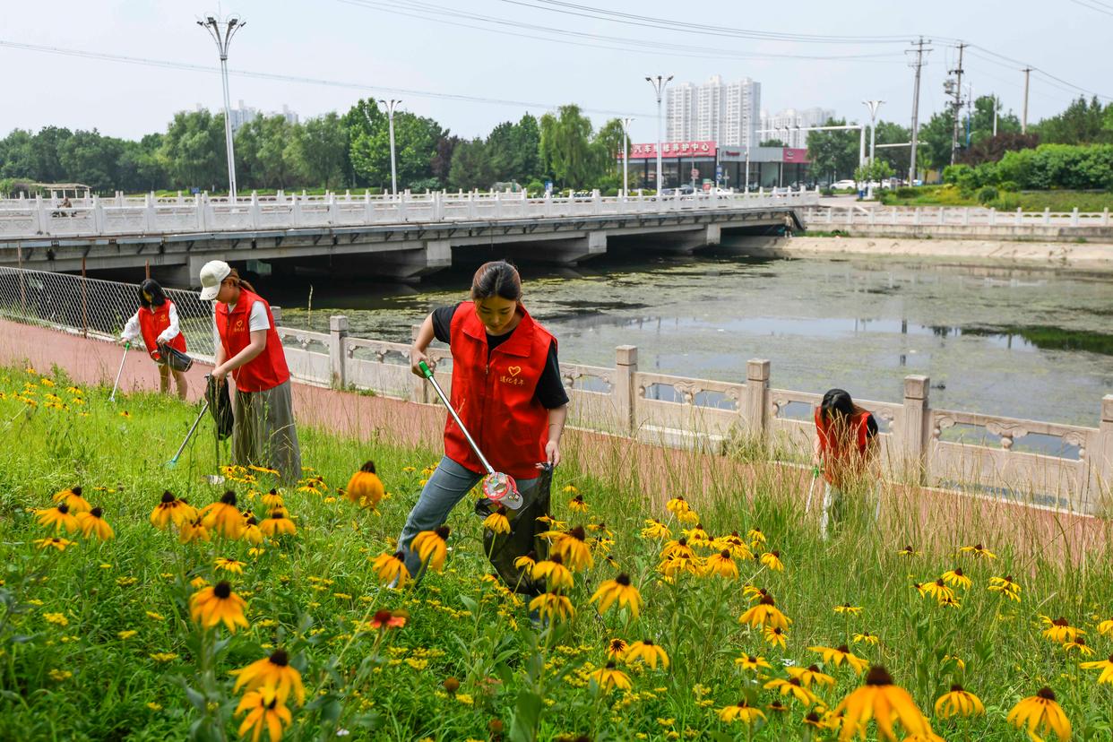 7月4日,返乡大学生志愿者在河北省遵化市森林公园捡拾垃圾杂物。新华社发(刘满仓摄)