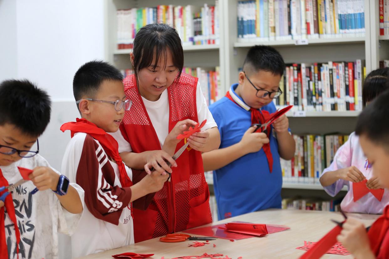 7月3日,志愿者在四川省乐山市市中区王浩儿街道社区爱心暑托班指导学生们剪纸。新华社发(李华时摄)