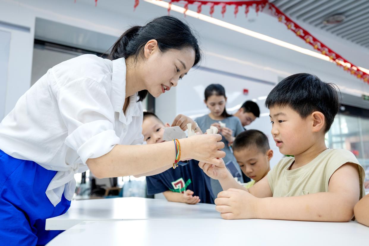 7月3日,浙江省湖州市长兴县龙山街道齐北社区幸福邻里中心,志愿者指导孩子们制作手工。新华社发(谭云俸摄)