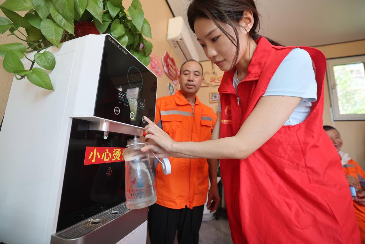 7月4日,在山东省临沂市沂南县历山路中段的一处工会驿站里,志愿者为环卫工人倒水。新华社发(王彦冰摄)