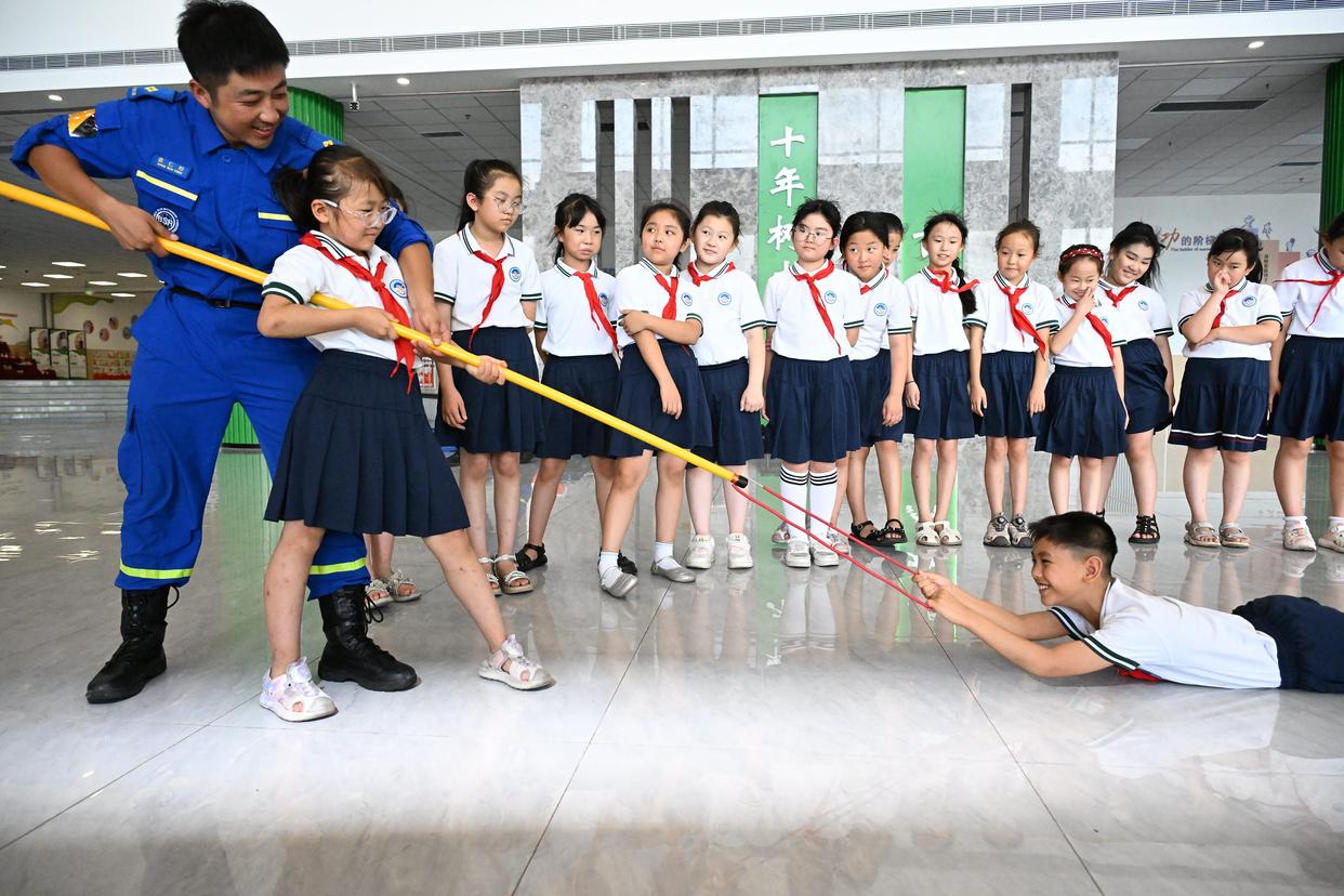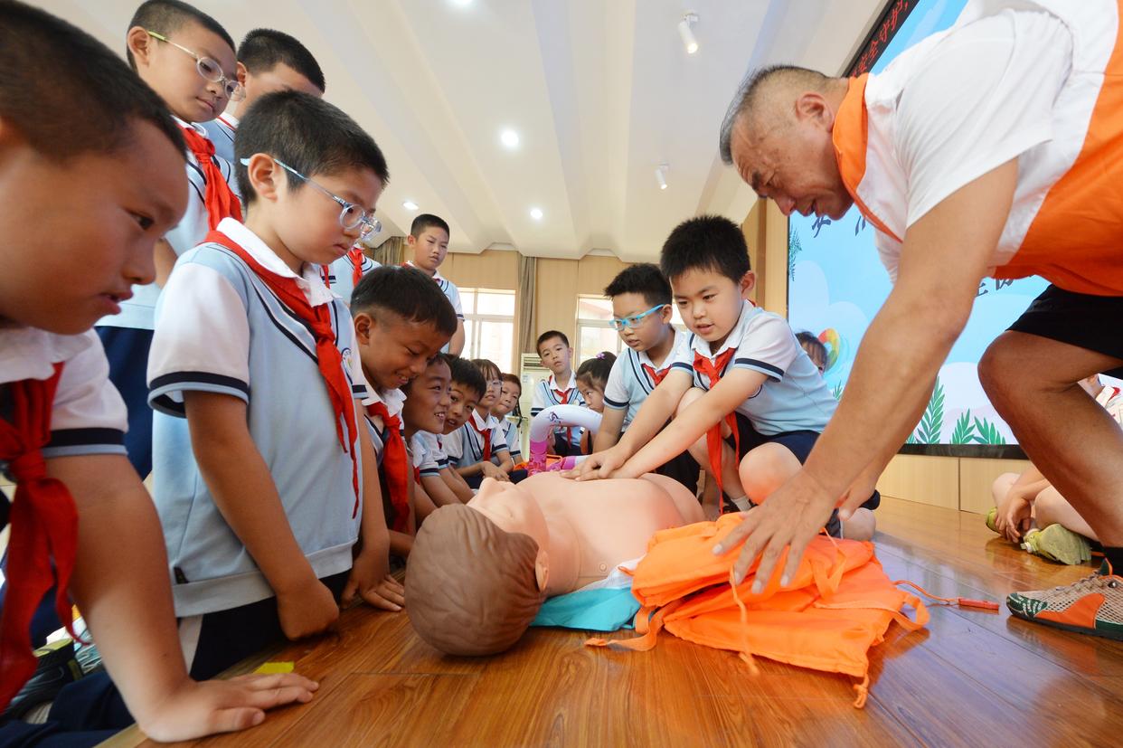 7月3日,山东省青岛市即墨区蓝天救援队志愿者在青岛市即墨区第三实验小学惠欣路分校指导小学生们学习防溺水自救互救知识。新华社发(张涛摄)
