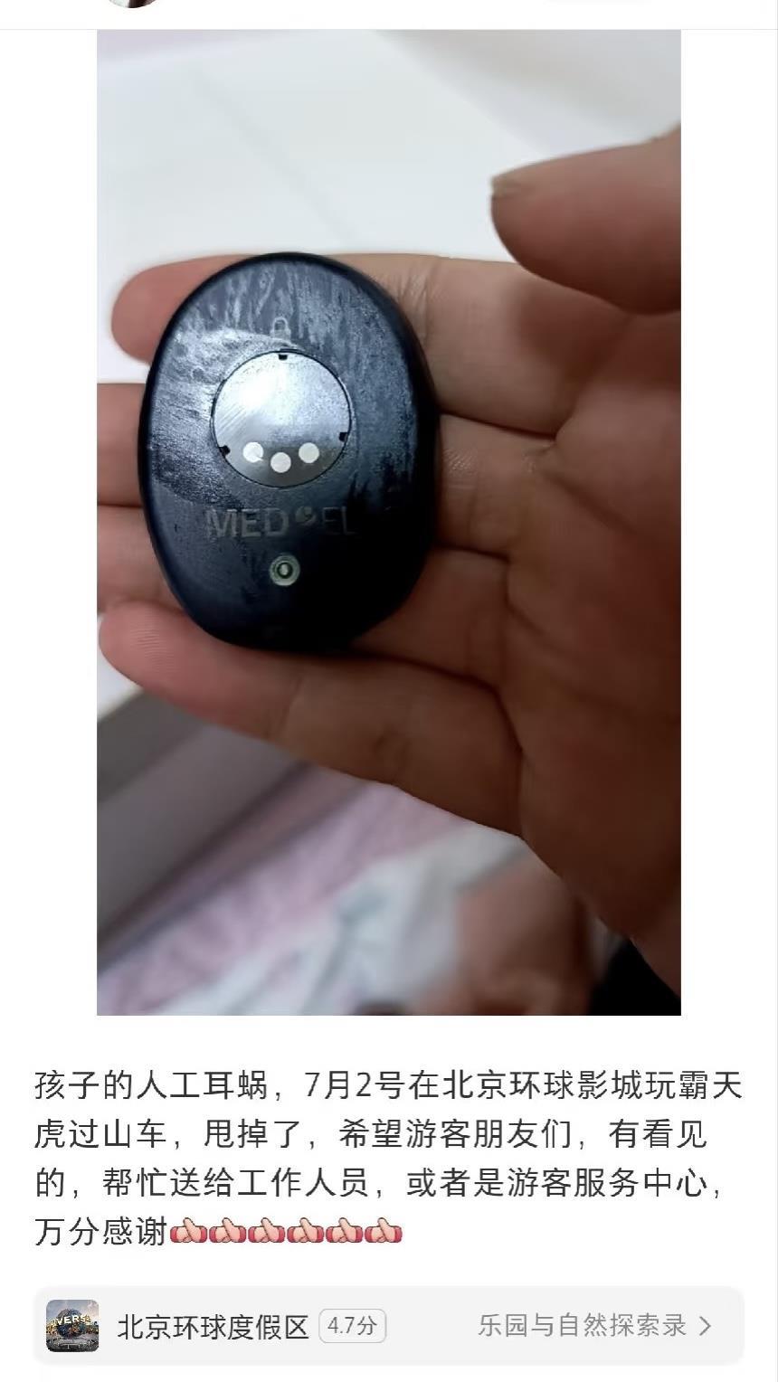 近日,有网友发文称,7月2日在北京环球影城乘坐霸天虎过山车时,孩子不慎将人工耳蜗丢失,希望看见耳蜗的游客能将其送至游客中心。