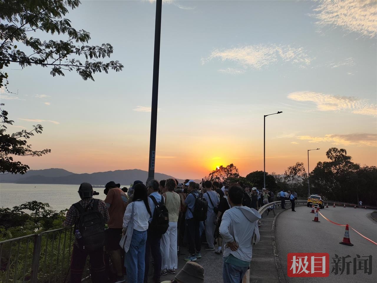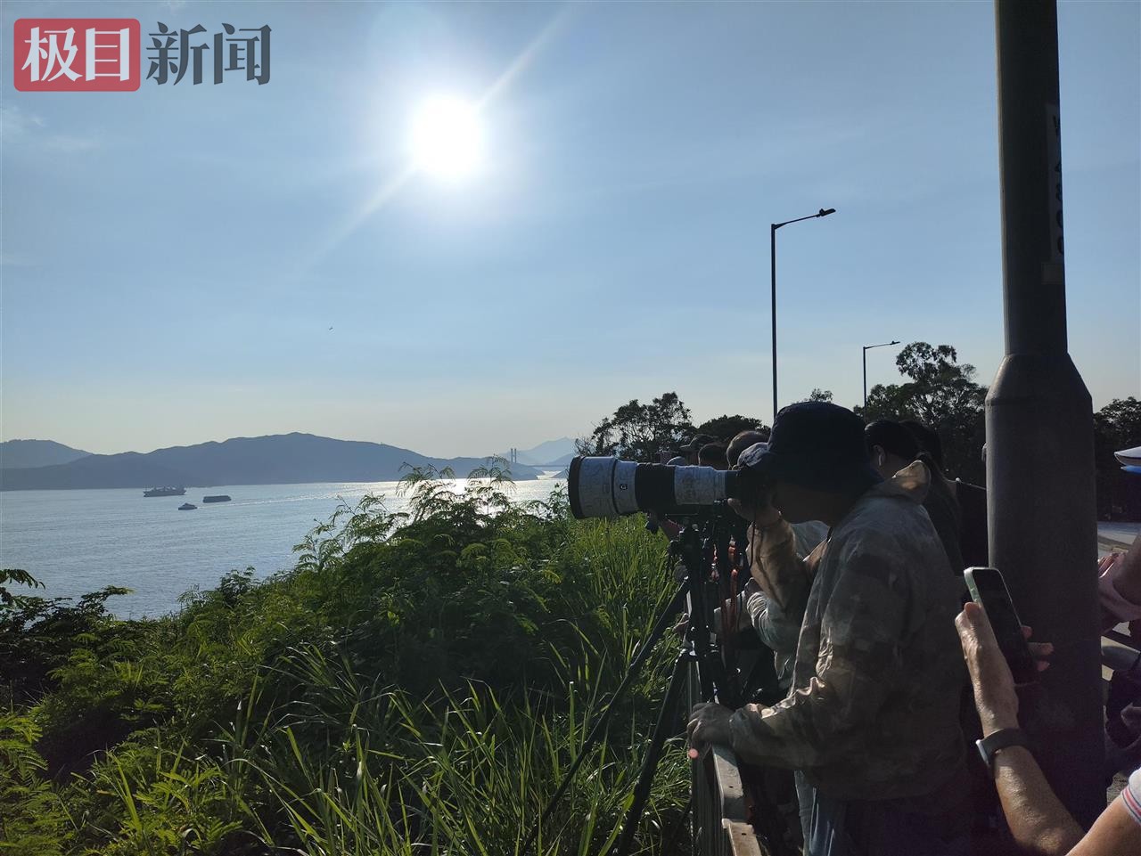 除了上舰参观,在维港附近各个海岸、高地,也聚集了大量市民,从岸上远眺、打卡山东舰航母编队。