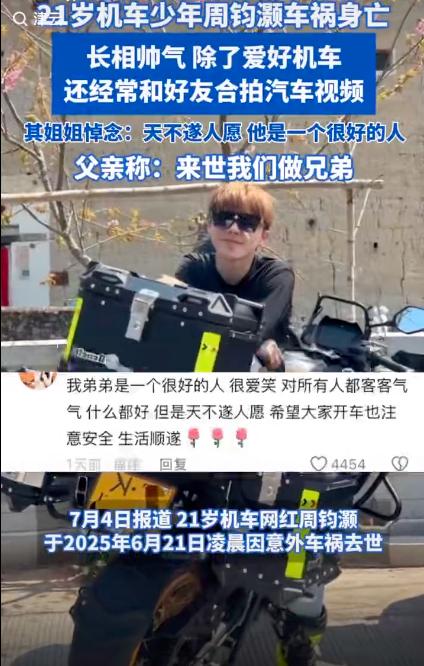 据津云7月4日报道:21岁机车网红周钧灏于2025年6月21日凌晨因意外车祸去世,其姐姐悼念:天不遂人愿,他是一个很好的人。父亲:来世我们做兄弟。