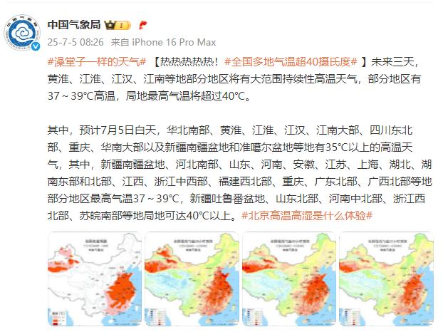 其中,预计7月5日白天,华北南部、黄淮、江淮、江汉、江南大部、四川东北部、重庆、华南大部以及新疆南疆盆地和准噶尔盆地等地有35℃以上的高温天气,其中,新疆南疆盆地、河北南部、山东、河南、安徽、江苏、上海、湖北、湖南东部和北部、江西、浙江中西部、福建西北部、重庆、广东北部、广西北部等地部分地区最高气温37~39℃,新疆吐鲁番盆地、山东北部、河南中北部、浙江西北部、苏皖南部等地局地可达40℃以上。
