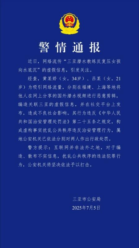警方通报:编造“三亚潜水教练反复压女孩向水底沉”虛假信息,2人被处罚
