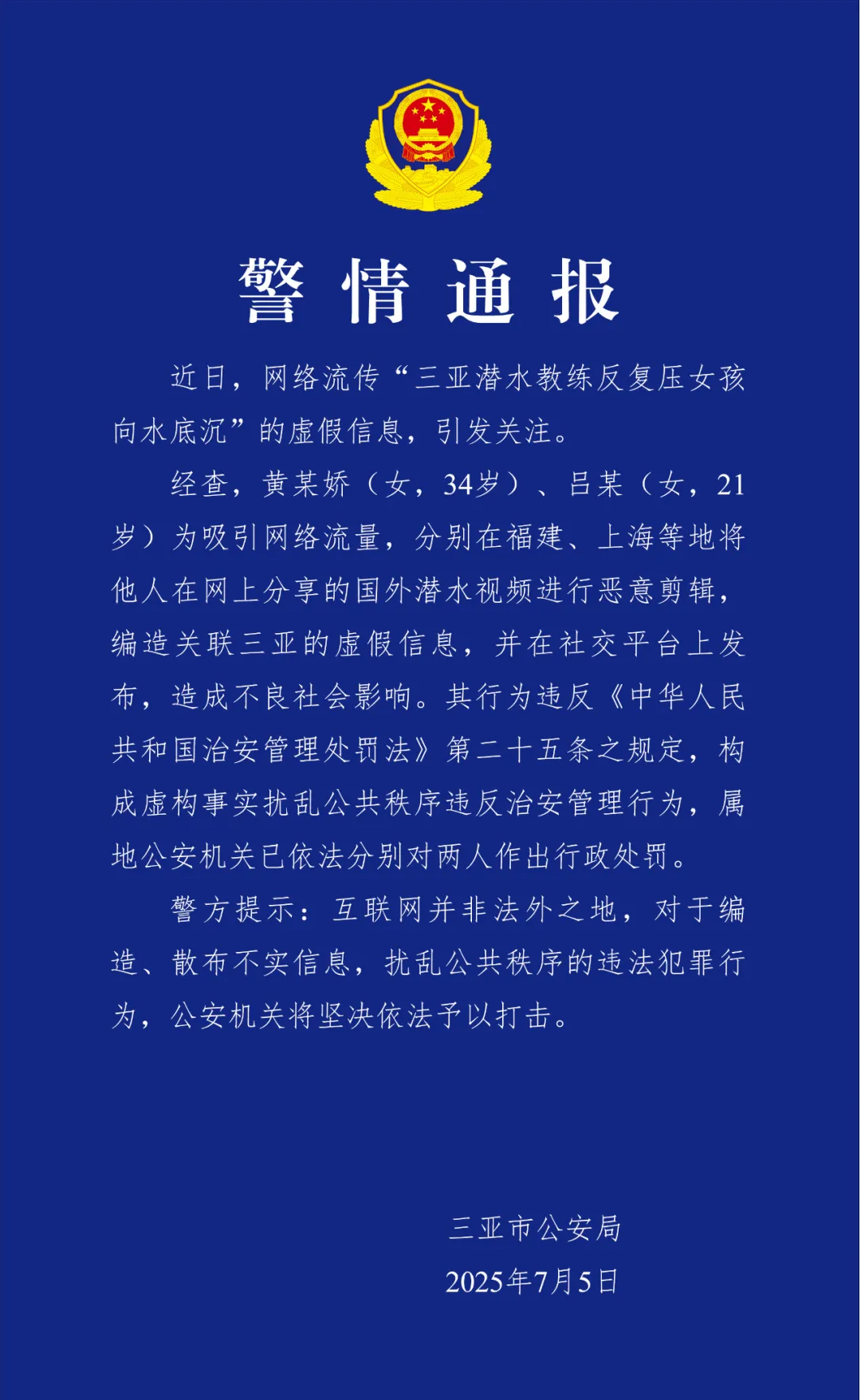 据“三亚警方”微信公众号消息,三亚市公安局7月5日发布警情通报称,近日,网络流传“三亚潜水教练反复压女孩向水底沉”的虛假信息,引发关注。