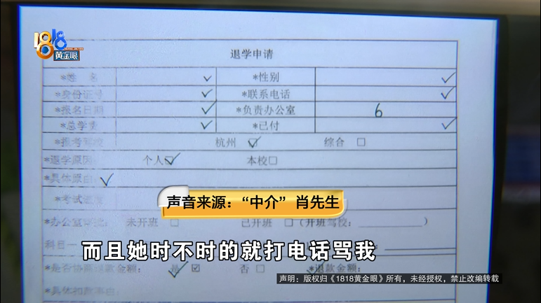 “中介” 肖先生:我要把钱退给你,跟盖不盖章一点关系都没有,她把那个退学申请填完之后,我这边备案,她这个学员已经退了,我们也得留个证据。