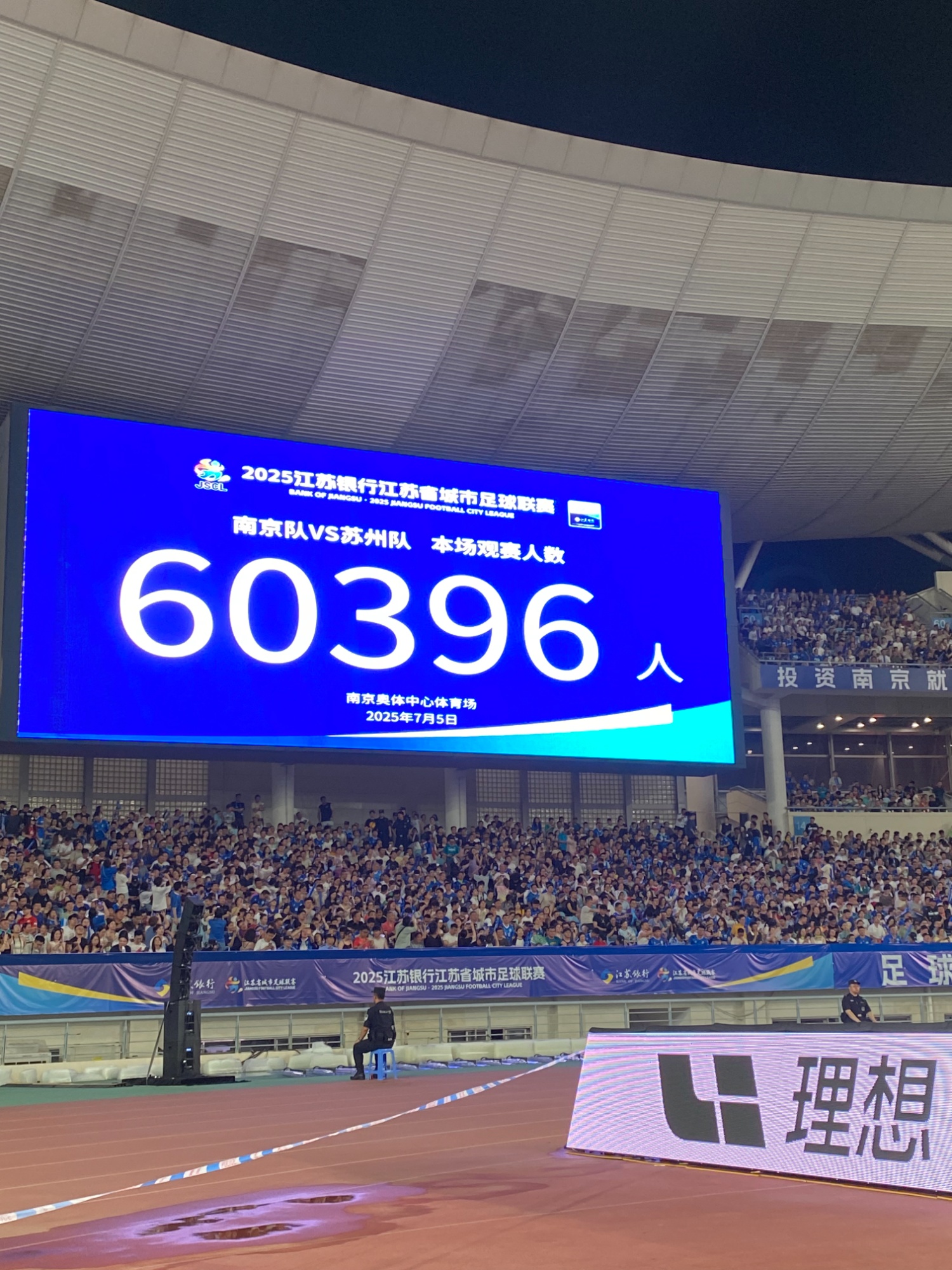 战至第75分钟,现场大屏显示,本场观赛人数已达60396人,打破了上周创下的“苏超”联赛单场上座纪录,也是刷新了中国业余足球赛上座纪录。