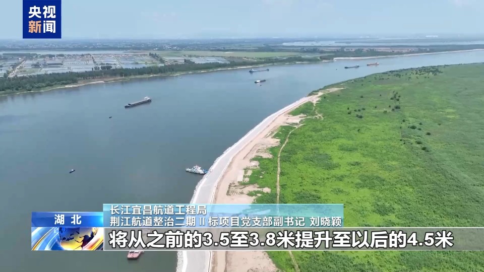 长江宜昌航道工程局 荆江航道整治二期Ⅱ标项目党支部副书记 刘晓颖:工程建设完成后,荆江河段枯水期的航道维护水深将从之前的3.5到3.8米提升至以后的4.5米,船舶吨级也将从3000吨级提升至将来的5000吨级,通航潜力将得到极大释放,进一步降低长江航运物流成本。