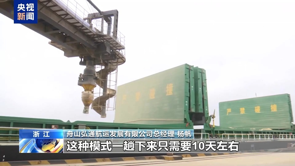 舟山弘通航运发展有限公司总经理 杨帆:以往大船难进江,小船难出海,我们运输货物需要换船,一趟约15天到20天。现在同一艘船舶完成由江入海运输全程,这种模式一趟下来只需10天左右,差不多能降低成本20万元。
