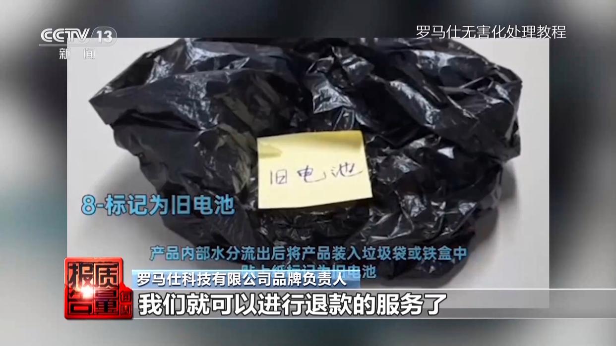 罗马仕科技有限公司品牌负责人:客户有一个自行处理的过程,比如放在盐水里面浸泡,等到24小时以后,再拿出来去丢弃(无害化)。或者寄回我们这边来,我们去做一个处理是可以的,我们就可以进行退款的服务了。