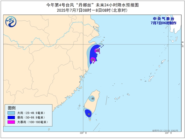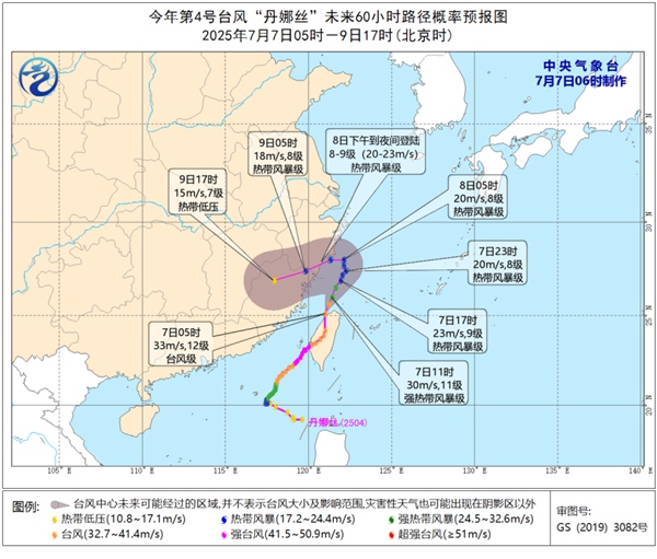 登陆了!中央气象台消息,今天(7月7日)凌晨0点前后,今年第4号台风“丹娜丝”在台湾嘉义县沿海登陆,登陆时由强台风级减弱为台风级,中心附近最大风力有13级(40米/秒),中心最低气压为960百帕。