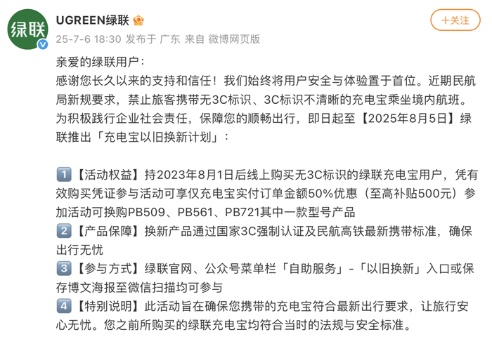 7月6日下午,充电宝品牌绿联通过微博发布消息称,即日起至2025年8月5日,绿联推出“充电宝以旧换新计划”,持2023年8月1日后线上购买无3C标识的绿联充电宝用户,凭有效购买凭证参与活动可享受仅充电宝实付订单金额50%优惠(至高补贴500元)参加活动可换购PB509、PB561、PB721其中一款型号产品。绿联方面强调,消费者之前所购买的绿联充电宝均符合当时的法规与安全标准,换新产品通过国家3C强制认证及民航高铁最新携带标准,确保出行无忧。