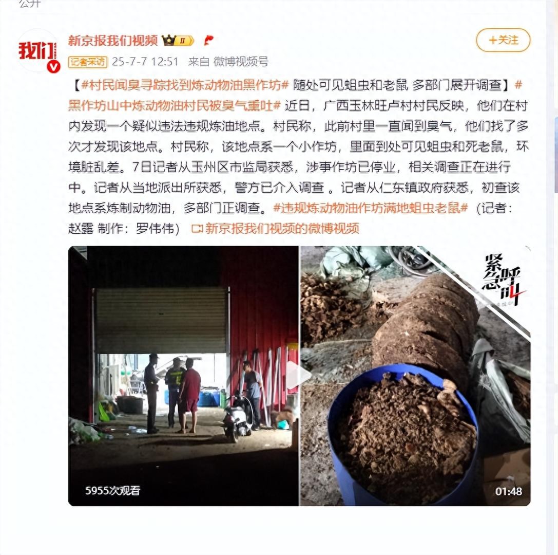 近日,广西玉林旺卢村村民反映,他们在村内发现一个疑似违法违规炼油地点。村民称,此前村里一直闻到臭气,他们找了多次才发现该地点。村民称,该地点系一个小作坊,里面到处可见蛆虫和死老鼠,环境脏乱差。7日记者从玉州区市监局获悉,涉事作坊已停业,相关调查正在进行中。记者从当地派出所获悉,警方已介入调查 。记者从仁东镇政府获悉,初查该地点系炼制动物油,多部门正调查。