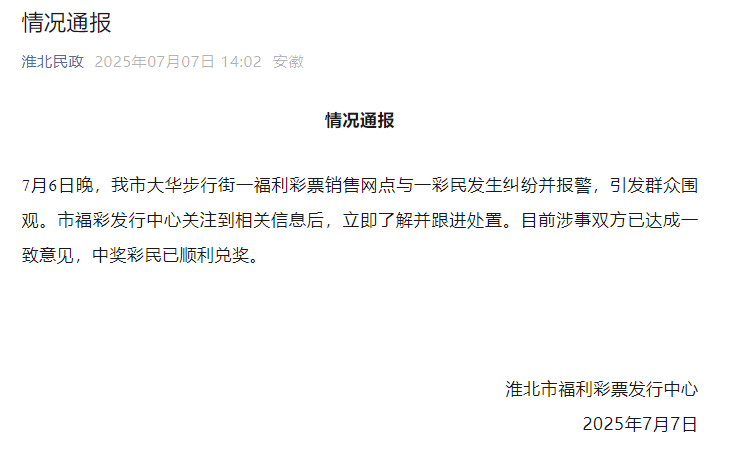 7月6日晚,我市大华步行街一福利彩票销售网点与一彩民发生纠纷并报警,引发群众围观。市福彩发行中心关注到相关信息后,立即了解并跟进处置。目前涉事双方已达成一致意见,中奖彩民已顺利兑奖。