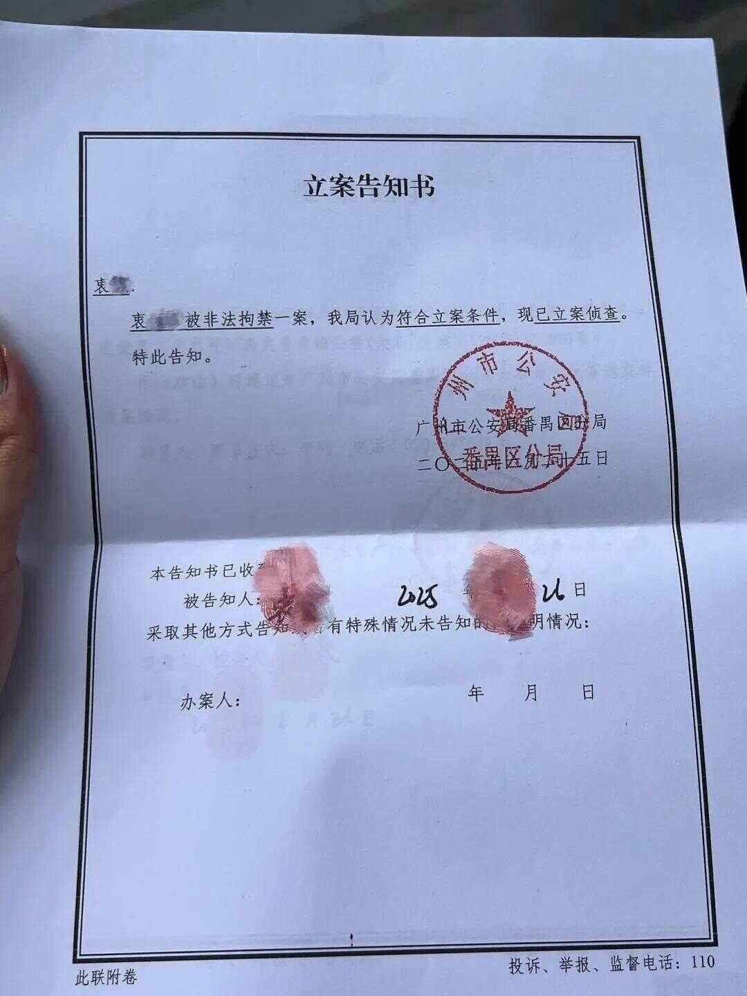 6月26日,衷女士收到了广州市公安局番禺区分局的立案告知书,警方以衷某某“被非法拘禁”,对此立案侦查。
