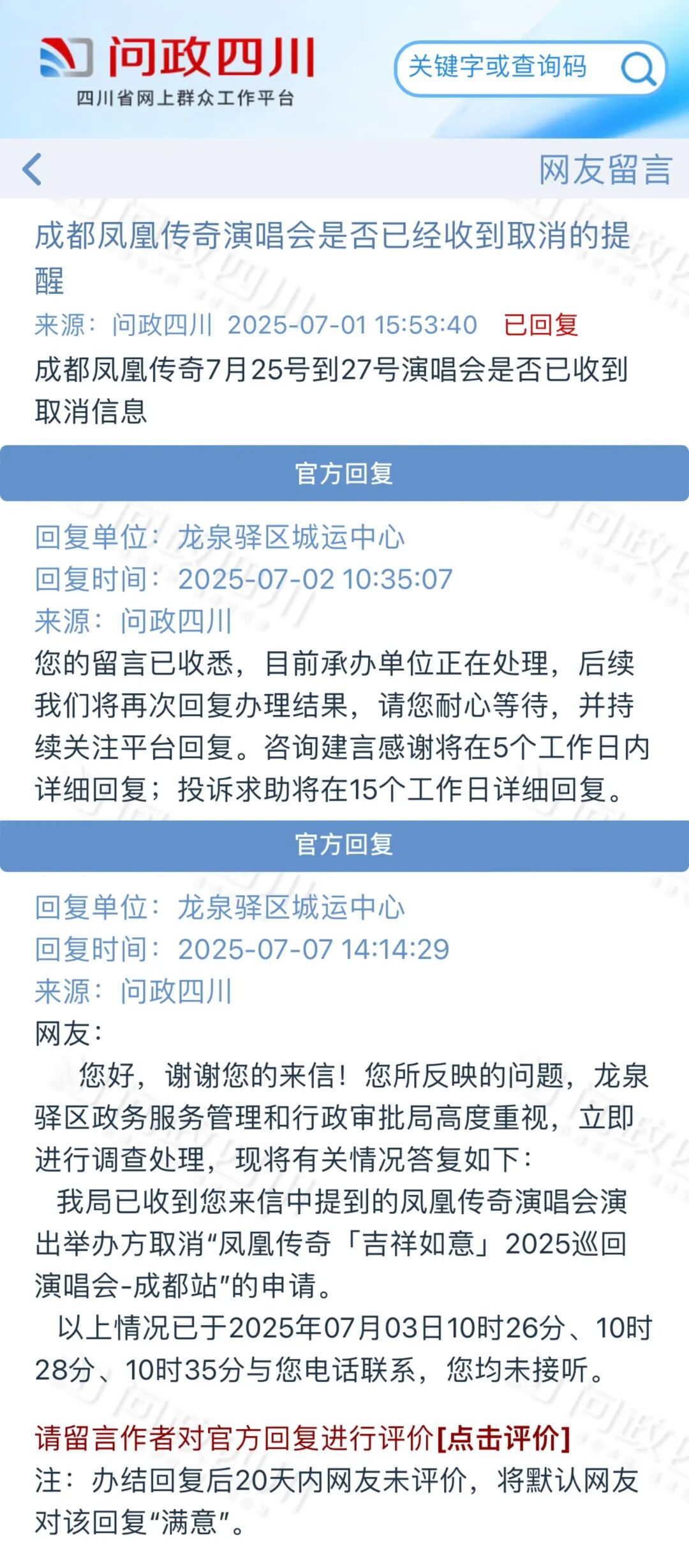 近日,网上有传言称“凤凰传奇7月成都站演唱会将取消”。有网友在问政四川平台上留言咨询相关问题“成都凤凰传奇7月25号到27号演唱会是否已收到取消信息”。对此,龙泉驿区城运中心回复称:我局已收到您来信中提到的凤凰传奇演唱会演出举办方取消“凤凰传奇「吉祥如意」2025巡回演唱会-成都站”的申请。