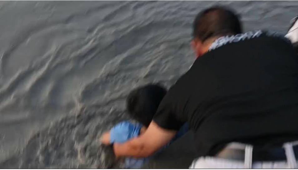 现场目击者拍下了赵成龙救人过程:孩子在江水中沉浮挣扎,很快被江水没过头顶;赵成龙跳进涪江后,在水中奋力划拉,然后伸手抓住孩子,另一只手把住岸边石阶,避免自己和孩子被湍急的水流带走。