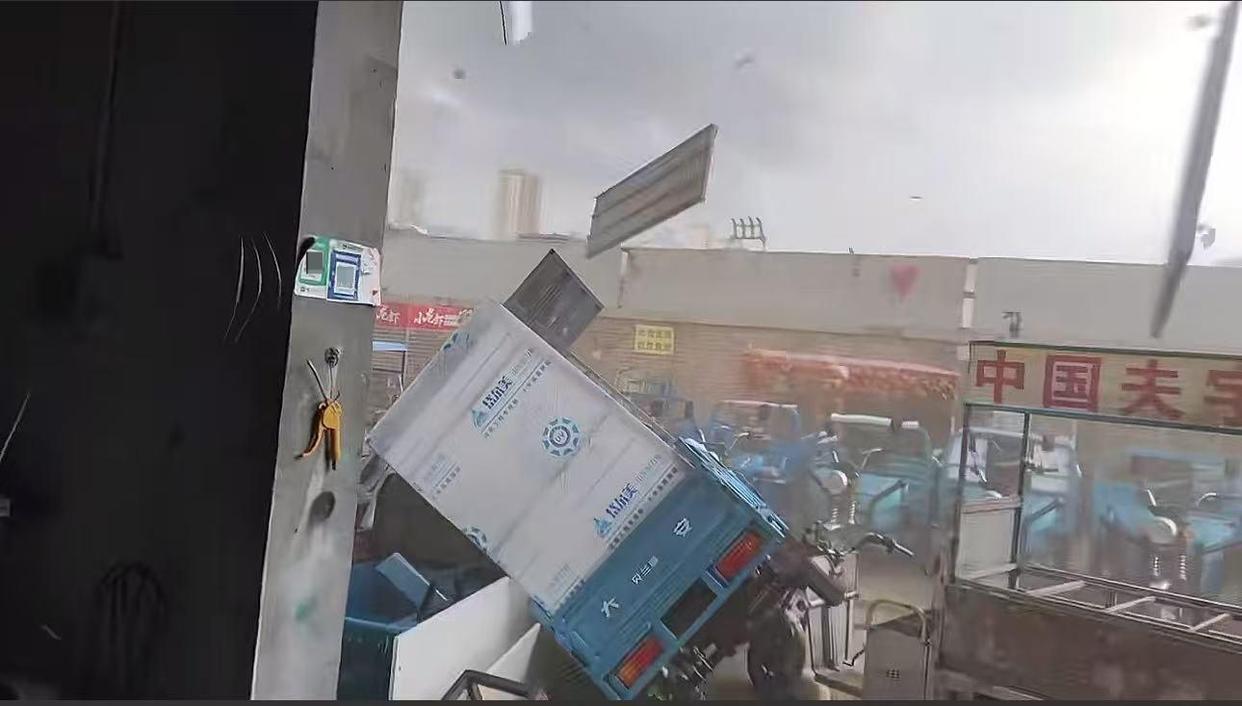 该男子提供的视频显示,狂风渐起,有杂物碎片被卷上天空,不时还有大片的简易板房房顶材料被吹落地上。据其回忆,大风过后下起了雨,“现在风停了,还在下小雨。”