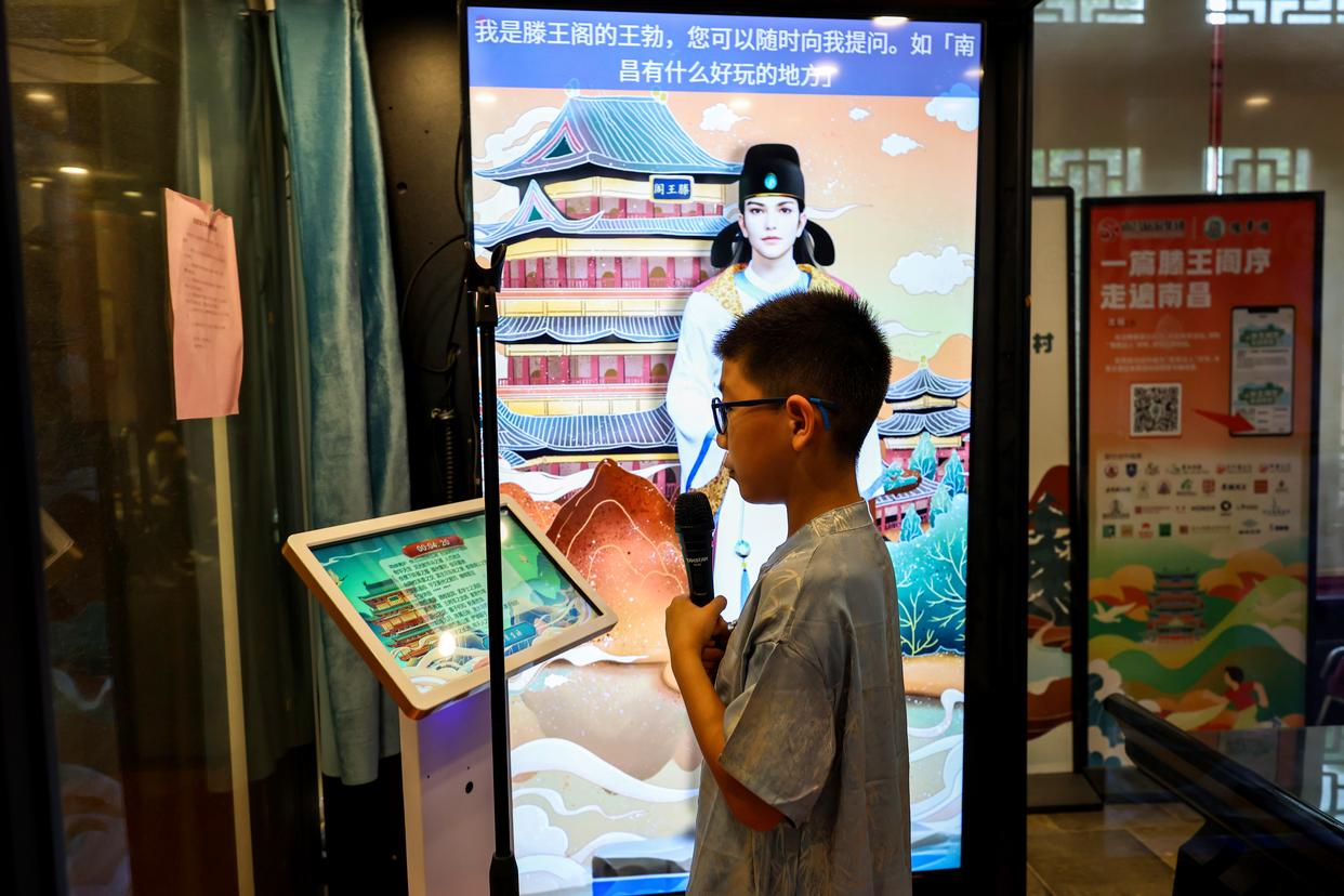 7月7日,一名来自河北秦皇岛的小学生在江西南昌滕王阁景区游客中心的智能背序亭内背诵《滕王阁序》。近年来,滕王阁景区推出背诵《滕王阁序》全文免门票活动,吸引了各地游客前来挑战。新华社记者 刘金海 摄