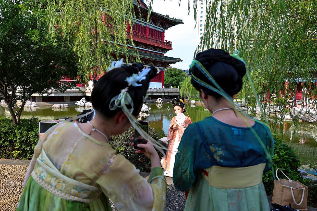 7月7日,身着古装的游客在江西南昌滕王阁景区游览留影。新华社记者 刘金海 摄