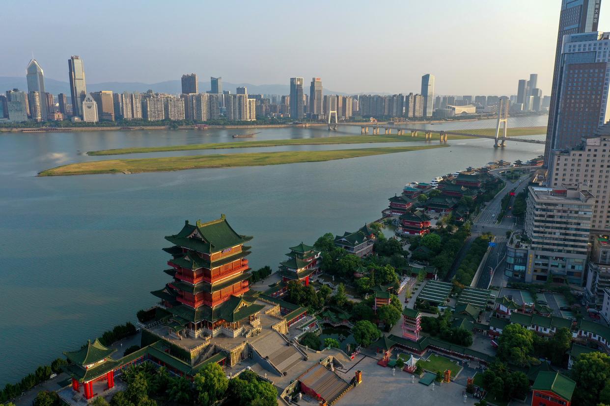 晨光中的江西南昌滕王阁景区(7月7日摄,无人机照片)。新华社记者 刘金海 摄