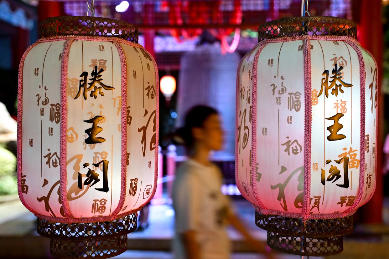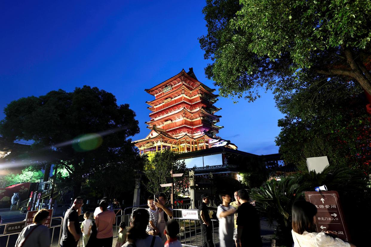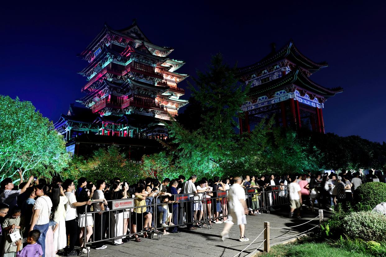 7月7日,夜间游览的游客在江西南昌滕王阁景区内排队等待登阁。新华社记者 刘金海 摄